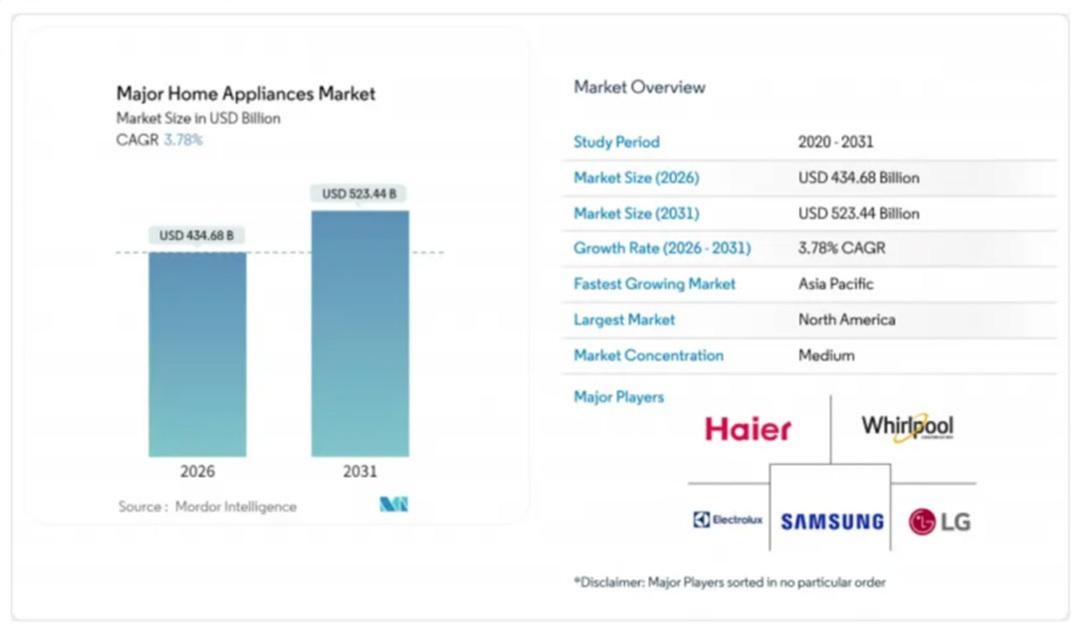 北美、欧盟监管缩短产品更换周期,新兴城市电价上涨更让能效级家电成消费首选。因为大型家用电器对住宅能耗有重大影响。这种对能源优化的关注预计将推动市场增长,因为人们希望用更新的节能选项替换旧有且效率较低的型号。